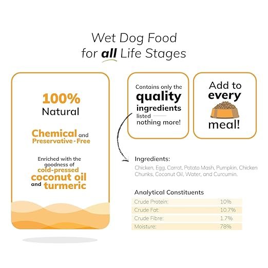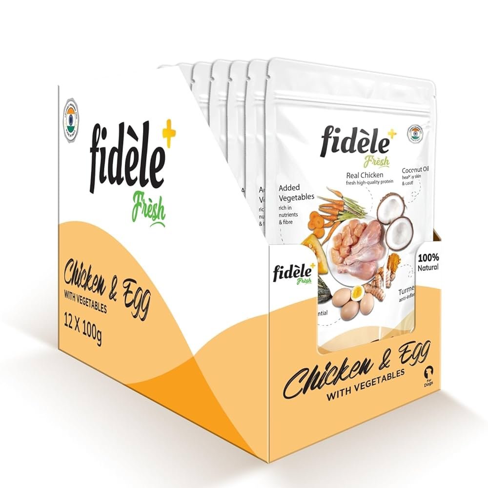 Give your dog the goodness of fresh chicken, eggs, and vegetables with Fidele+ Fresh—a delicious, grain-free meal topper designed to enhance your pet’s daily diet. Made with all-natural ingredients, this soft and nutritious topper is free from preservatives and artificial additives, making it perfect for even the fussiest eaters. Inspired by Indian traditions, we’ve enriched this meal with turmeric (curcumin) for anti-inflammatory benefits and cold-pressed coconut oil to promote a healthy skin and coat. Whether used as a meal topper or a tasty treat, Fidele+ Fresh is a simple and nutritious way to support your pet’s well-being—just like ‘Ghar Jaisa Khaana’! Key Features: ✔ All-Natural & Chemical-Free – No artificial preservatives or additives. ✔ Rich in Protein & Essential Nutrients – Includes fresh chicken & egg for muscle health. ✔ Grain-Free & Easily Digestible – Ideal for sensitive stomachs. ✔ Soft & Tasty Kibble Enhancer – Perfect for picky eaters. ✔ Skin & Coat Care – Cold-pressed coconut oil for shine & nourishment. ✔ Joint & Immunity Support – Turmeric (Curcumin) for anti-inflammatory benefits. Feeding Guidelines: Up to 5 kg: 1 pouch + daily dry food. 5 to 10 kg: 2 pouches + daily dry food. 10 to 25 kg: 3 pouches + daily dry food. Always provide fresh drinking water. Ingredients: Chicken, Egg, Carrot, Potato Mash, Pumpkin, Chicken Chunks, Coconut Oil, Water & Curcumin. Nutritional Analysis (Per 100g): Crude Protein: 10% Crude Fat: 10.7% Crude Fibre: 1.7% Moisture: 78%