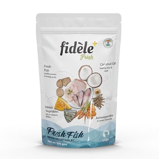 Every time you open a pouch of Fidele+ Fresh, you’ll see the goodness of fresh fish and vegetables. Our simple, tasty, grain-free recipe is crafted with all-natural ingredients, free from preservatives and additives. Rooted in Indian traditions, we’ve enriched this meal with turmeric for its anti-inflammatory benefits and cold-pressed coconut oil to promote a shiny, healthy coat. Give your furry friend the nourishment they deserve with ‘Ghar Jaisa Khaana’—just like home-cooked food! Key Features: ✔ All-Natural Ingredients – No artificial chemicals, preservatives, or additives. ✔ Rich in Protein & Healthy Fats – Supports muscle development & overall health. ✔ Skin & Coat Care – Enriched with cold-pressed coconut oil for a shiny coat. ✔ Anti-Inflammatory Benefits – Contains turmeric to support joint health. ✔ Delicious & Nutritious – Made with real fish, vegetables, and essential nutrients. ✔ Grain-Free Formula – Easy to digest and suitable for sensitive stomachs. Feeding Guidelines: Up to 5 kg: 1 pouch + daily dry food. 5 to 10 kg: 2 pouches + daily dry food. 10 to 25 kg: 3 pouches + daily dry food. Always provide fresh drinking water. Ingredients: Fresh Fish, Potato Mash, Carrot, Pumpkin, Fish Chunks, Coconut Oil, Water & Ashwagandha. Nutritional Analysis (Per 100g): Crude Protein: 8.5% Crude Fat: 11% Crude Fibre: 1.75% Moisture: 78%.