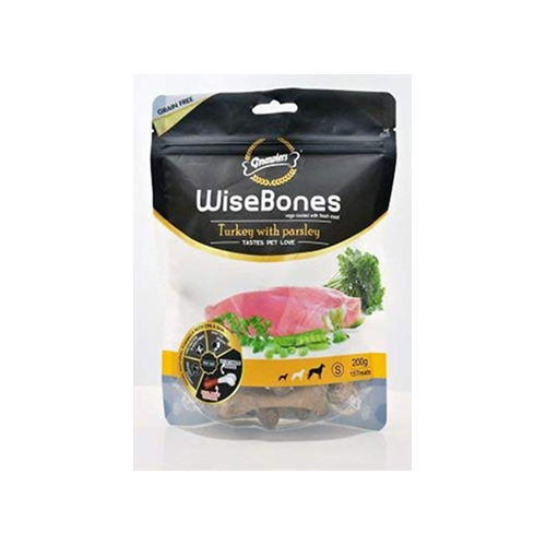 The Gnawlers Wise Bone Turkey With Parsley 210gm Small is the perfect treat for your furry friend. Made with real turkey and infused with parsley, this bone is sure to keep dogs entertained for hours as they gnaw away. At 210 grams, it is on the smaller side making it suitable for toy and smaller breed dogs. The turkey and parsley combination not only smells delicious but also helps support oral health. Unlike rawhide chews, this bone is digestible and less likely to cause blockages. It’s also a great way to keep pup occupied when you can’t be there to play. With its natural ingredients and digestible material, the Gnawlers Wise Bone Turkey With Parsley 210gm Small is a fun and healthy snack that all dogs will enjoy.
