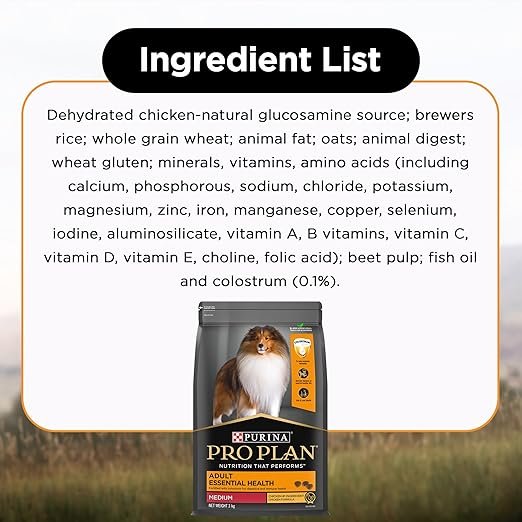 Dehydrated chicken-natural glucosamine source; brewers rice; whole grain wheat; animal fat; oats; animal digest; wheat gluten; minerals, vitamins, amino acids (including calcium, phosphorous, sodium, chloride, potassium, magnesium, zinc, iron, manganese, copper, selenium, iodine, aluminosilicate, vitamin A, B vitamins, vitamin C, vitamin D, vitamin E, choline, folic acid); beet pulp; fish oil and colostrum (0.1%)